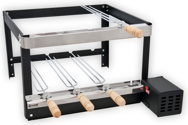 Produzido em aço carbono com pintura eletrostática preta, grill giratório para 4 espetos e grill manual para outros 3 espetos na nova calha superior em INOX.