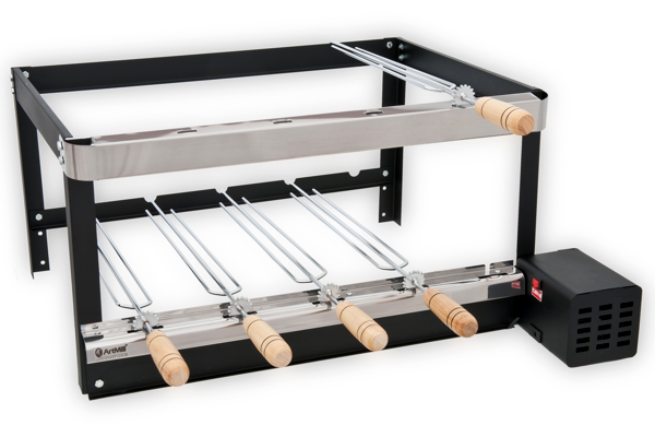 Produzido em aço carbono com pintura eletrostática preta, grill giratório para 5 espetos e grill manual para outros 4 espetos na nova calha superior em INOX.