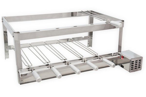 Produzido em aço inoxidável 430, grill giratório para 6 espetos e grill manual para outros 5 espetos na nova calha superior em INOX.