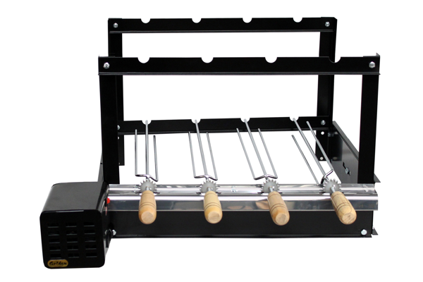 Produzido em aço carbono com acabamento em preto fosco eletroestático, possui calha frontal em inox, regulagem de profundidade, espaçamento entre espetos menor (Baby), grill giratório para 4 espetos e grill manual para outros 4 espetos na travessa superior.